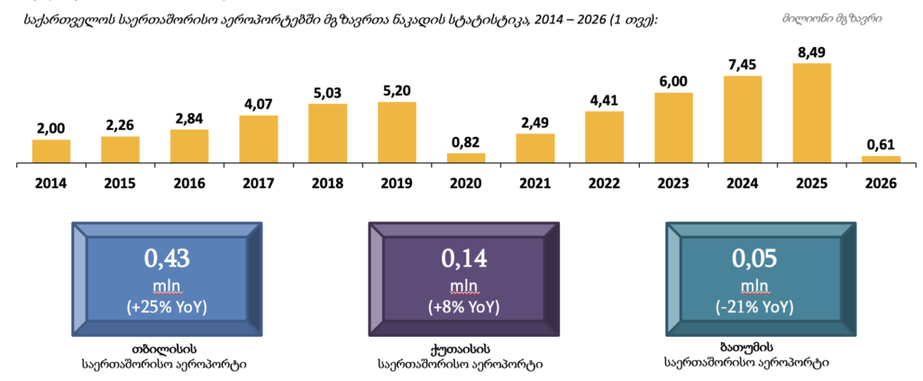 საქართველოს სამოქალაქო ავიაციის სააგენტოს შეჯამებული მონაცემების მიხედვით, 2026 წლის იანვარში საქართველოს აეროპორტებში მგზავრთნაკადი 16%-ით გაიზარდა და ჯამში 613,933 მგზავრს მოემსახურა. შესრულდა 2,873 ავიარეისი, რაც წინა წლის ანალოგიურ პერიოდთან შედარებით 16%-იანი ზრდაა. მნიშვნელოვნად გაიზარდა სატვირთო გადაზიდვებიც, კერძოდ 3,147 ტონა ტვირთი რაც 39%-ით აღემატება 2025 წლის იანვრის თვის მონაცემებს. ამას გარდა, 10%-ით გაიზარდა ქვეყნის საჰაერო სივრცის გამოყენება და თვეში ჯამურად 24,387 ფრენა დაფიქსირდა.