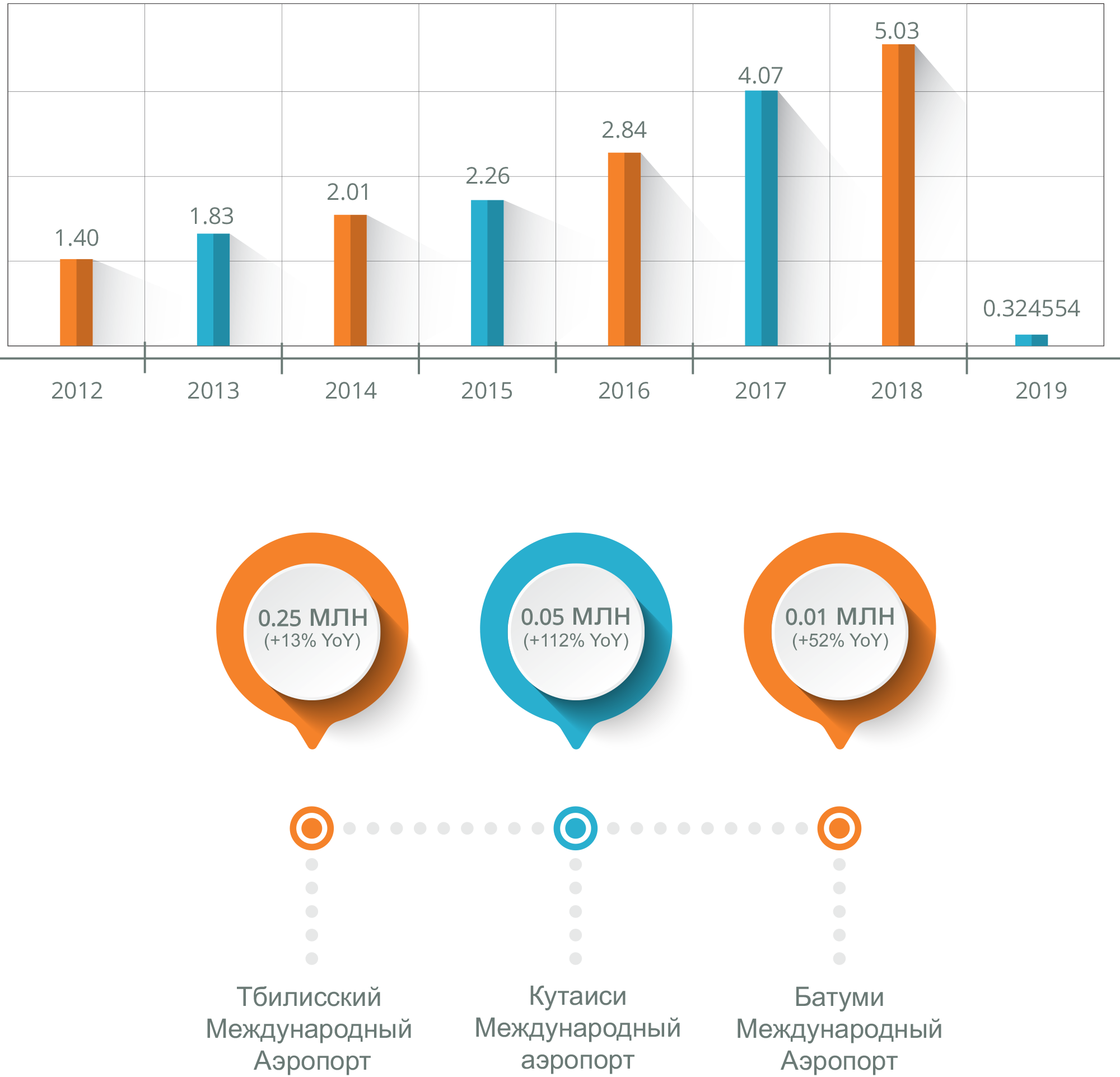 Статистика трафика международных пассажиров в аэропортах Грузии, 2012 – 2019 1 месяц гг: